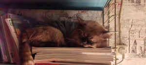 Мой кот мило спит на книжной полке